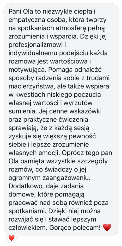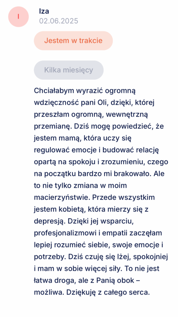 Wspieram mamy w trudnościach macierzyństwa i kryzysach, które pojawiają się na ich drodze. Presja społeczna z którą spotykają się mamy na każdym etapie stawia przed nimi niemożliwe do spełnienia zadania. Kobiety często słyszą nawet od najbliższych: czego się spodziewałaś, powinnaś być wdzięczna, jeszcze za tym zatęsknisz. Mamy często czują, że coś z nimi nie tak, skoro czują złość, bezsilność a nawet tęsknotę za życiem bez dziecka. Mają z tego powodu wyrzuty sumienia i myśli, że dobra mama nie czuje takich emocji. A przecież macierzyństwo jest trudne a emocje z nim związane – naturalne. Pomagam mamom zrozumieć przyczyny tych emocji, uczę jak je regulować i o czym informują. Wspieram w opiekowaniu się sobą z równą troską, co swoim dzieckiem. Aby macierzyństwo nie opierało się na kontrolowaniu trudnych emocji a zamiast tego było pełne radości i spełnienia.